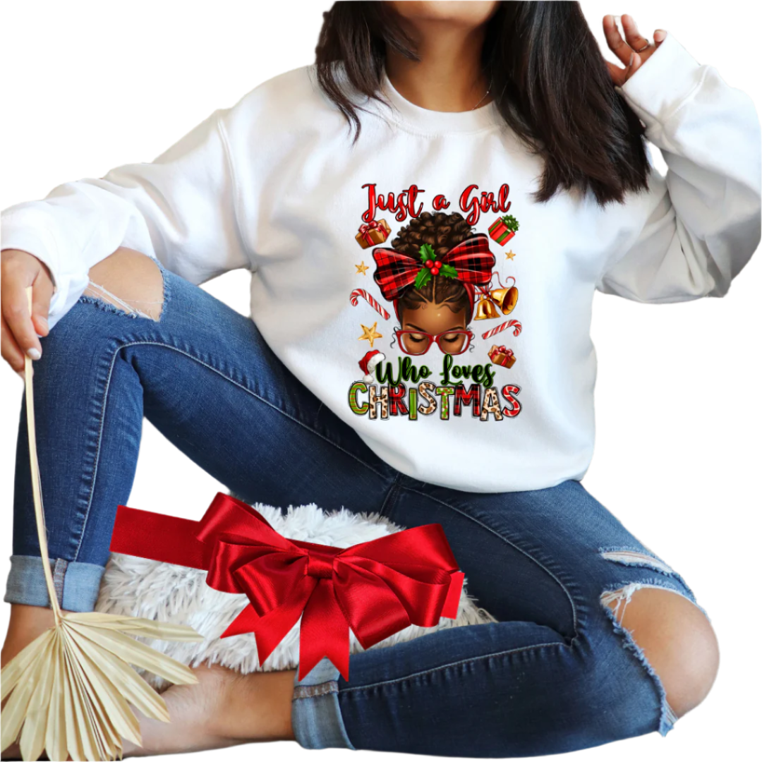 Spread holiday cheer with our "Just a Girl who loves Christmas" sweatshirt or T-shirt! Designed for the girl who can't get enough of the holiday season, this cozy apparel is perfect for lounging by the fire or attending festive gatherings. Show off your love for Christmas and make a statement with this fun and festive piece!